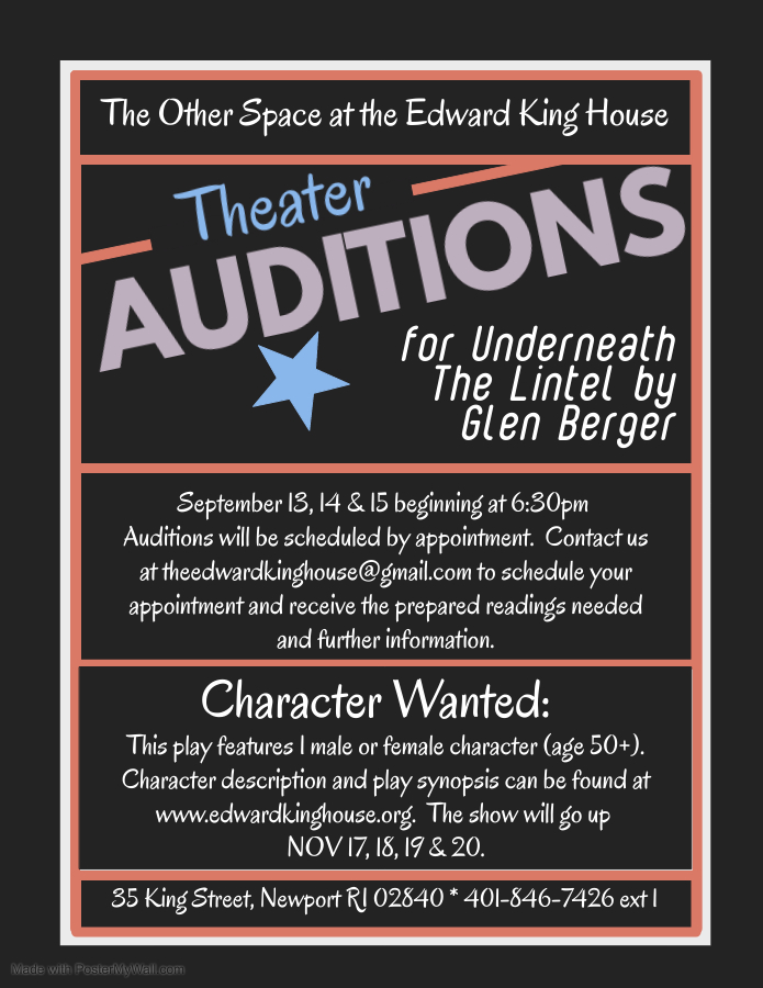 The Edward King House Senior Center announced the audition dates for its upcoming Fall production of Glen Berger’s Underneath the Lintel under the direction of Abby Adams. A one man or woman show the revolves a sole character—the Librarian— who embarks on a quest to find out who anonymously returned a library book that is 113 years overdue. A clue scribbled in the margin of the book and an unclaimed dry-cleaning ticket then take him or her on a mysterious adventure that spans the globe and the ages. The show is scheduled to run from November 17th to the 20th in the Other Space at the Edward King House.
