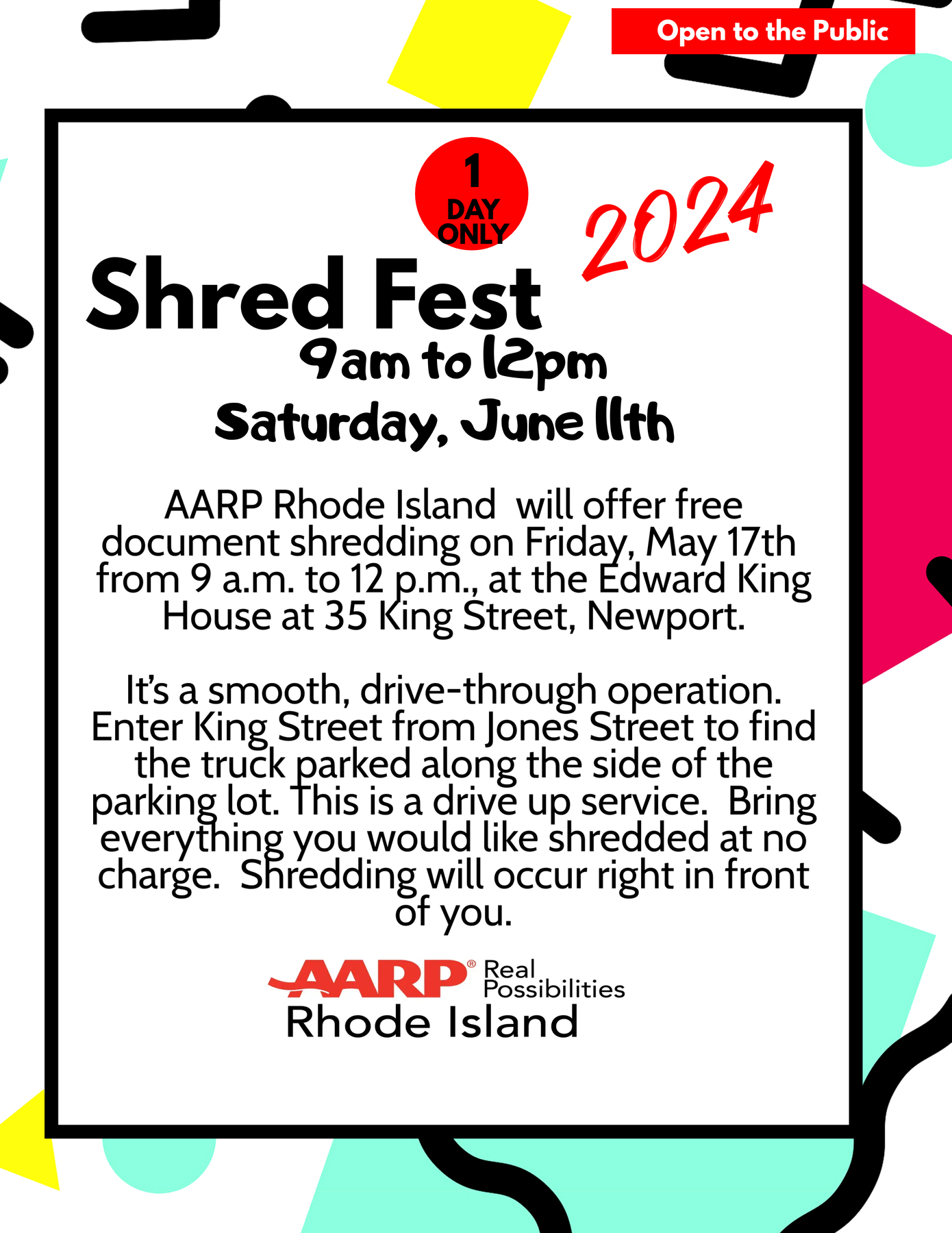 2024-05-17 09:00 2024-05-17 12:00 America/New_York AARP Shredding Event 35 King Street, Newport RI