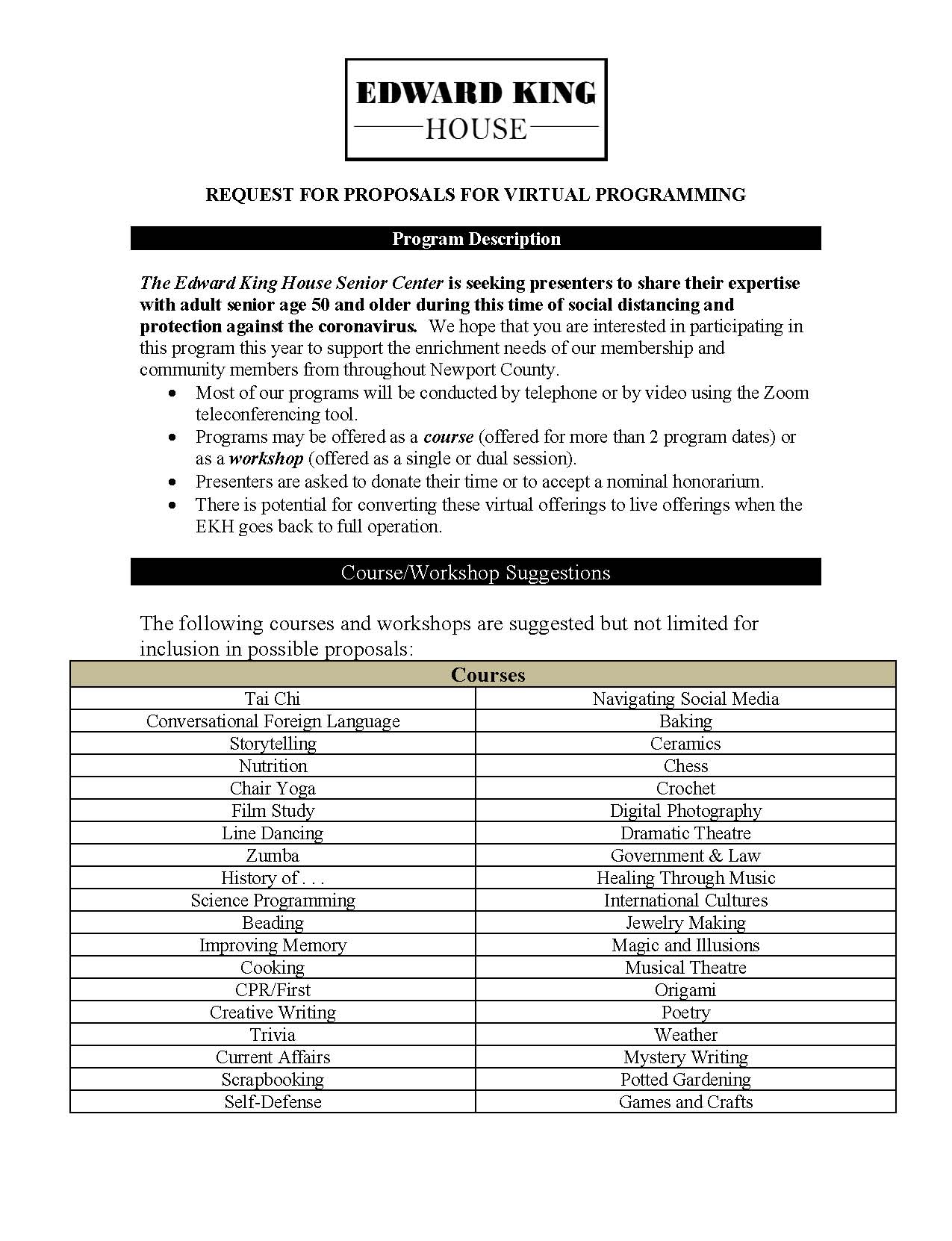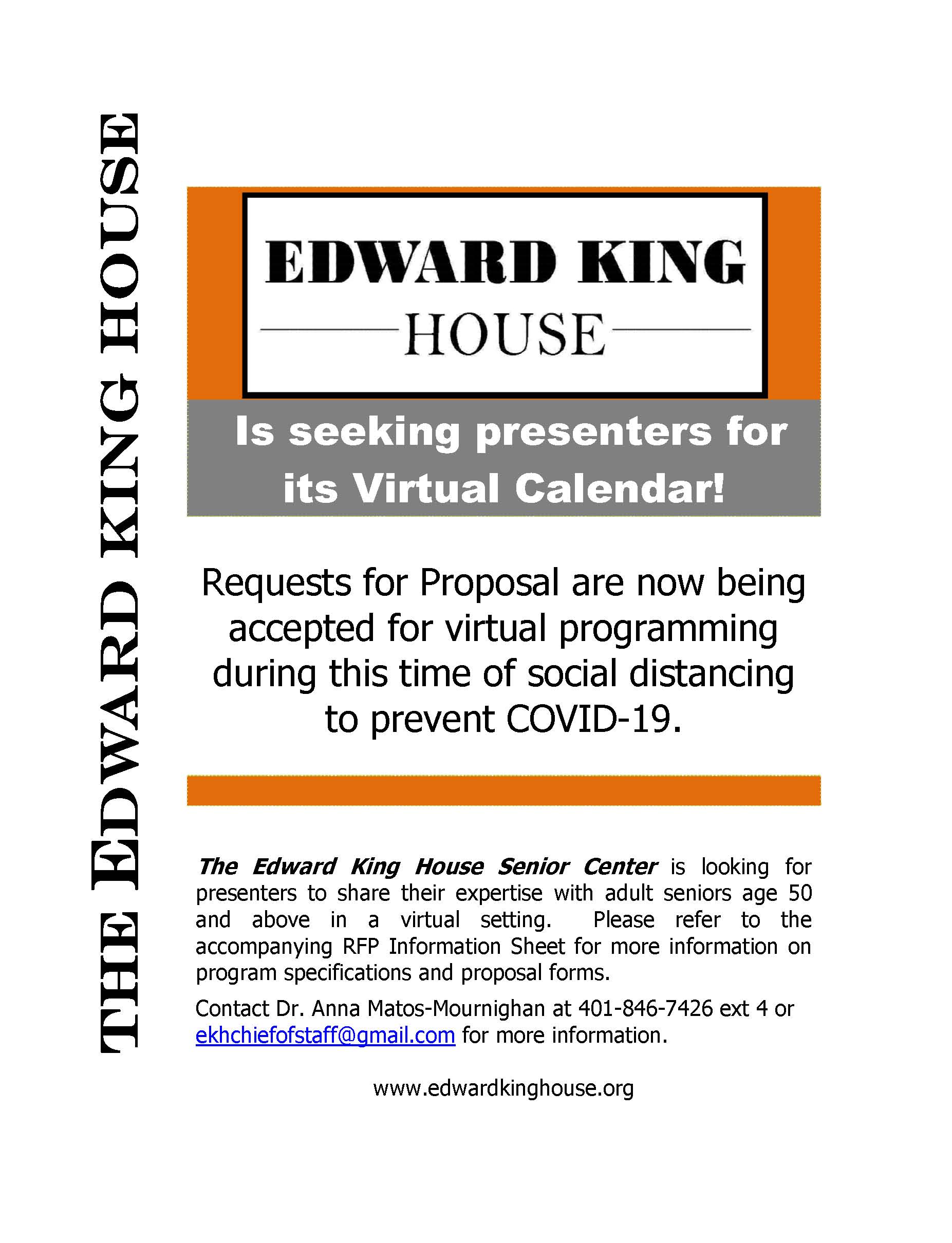 Providing Senior Center services is more important today than it ever had before. The Edward King House is adapting to the needs of our community by developing and sharing live and recorded content online to keep us connected. We are now actively looking for presenters who are interested in teaching either by recording, a video conferencing format or by telephone.